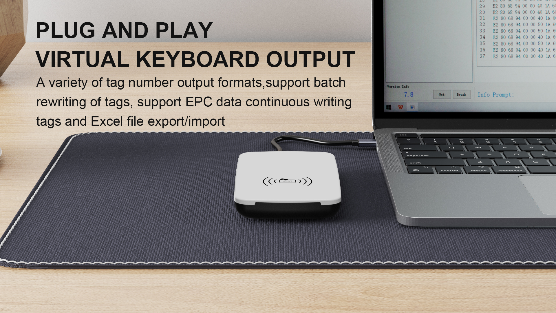 JTSPEEDWORK JT-6210 UHF RFIDデスクトップリーダーは、デュアルUSBインターフェースを搭載し、ISO18000-6C(860~960MHz)規格と0~80cmの読み取り範囲に対応しています。バッチタグ操作、暗号化/認証、ファームウェアアップグレードが可能で、マルチフォーマット出力に対応し、二次開発用のC++/C#/Java/Android SDKも提供しています。