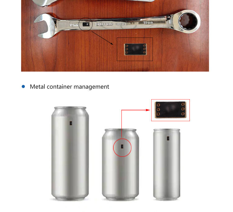これ UHF RFIDツール耐金属タグは、 特別 タグと 配置済み 円筒形の金属物体の側面.